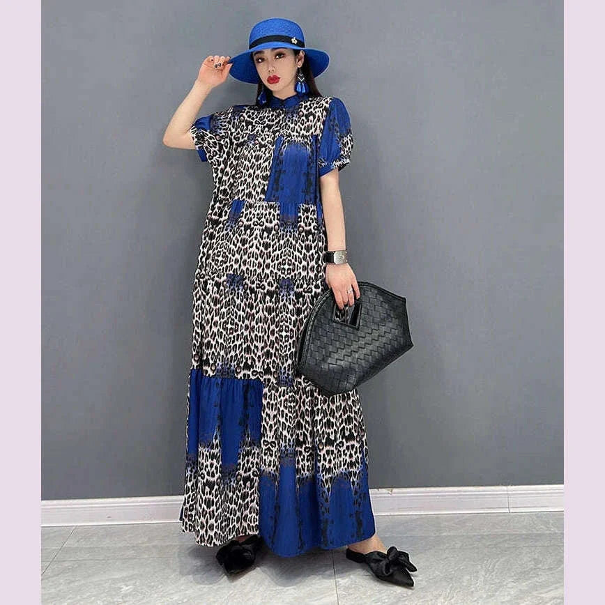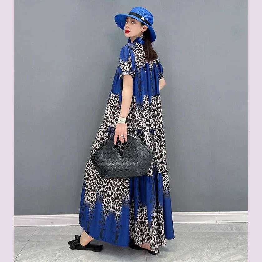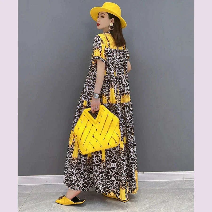 Korean Style Painted Short-Sleeve Casual Loose Big Size Yellow Red Blue Leopard Long Dress Summer Boho Print Dress Robe JJXD071