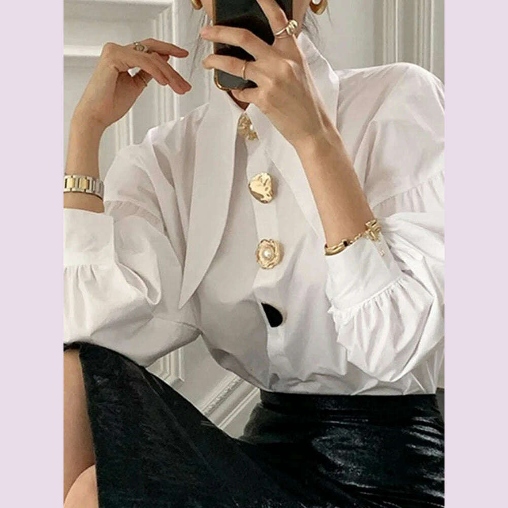 White Elegant Pearl Women Shirts Korean Sharp Corner Collar Loose Long Sleeve Ladies Blouse Y2k Fashion New Chic Female Tops
