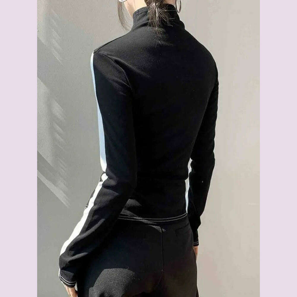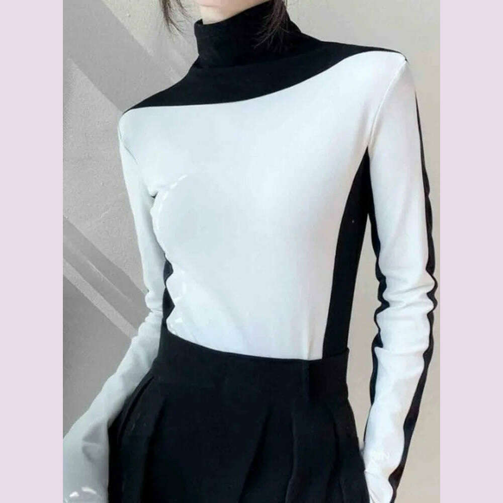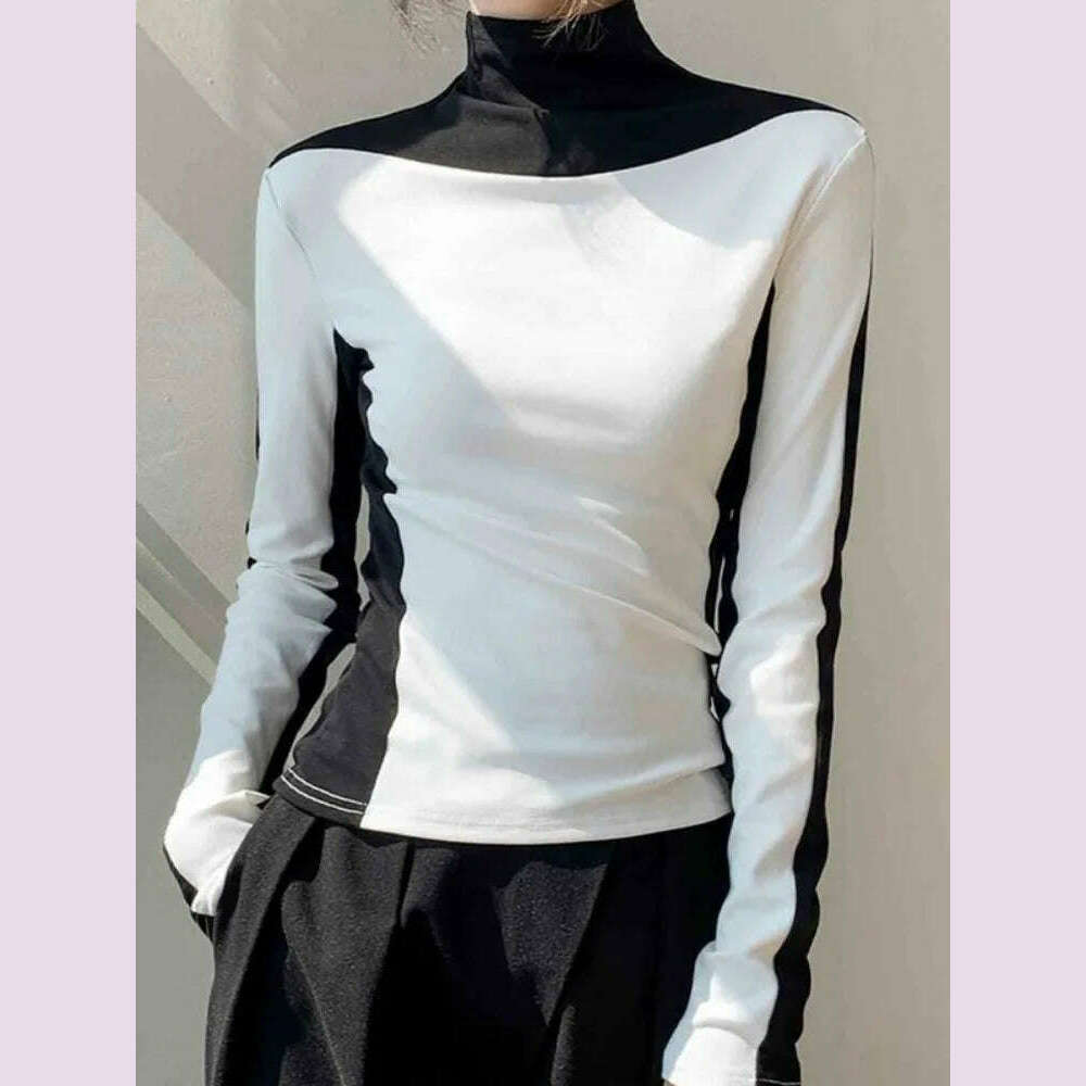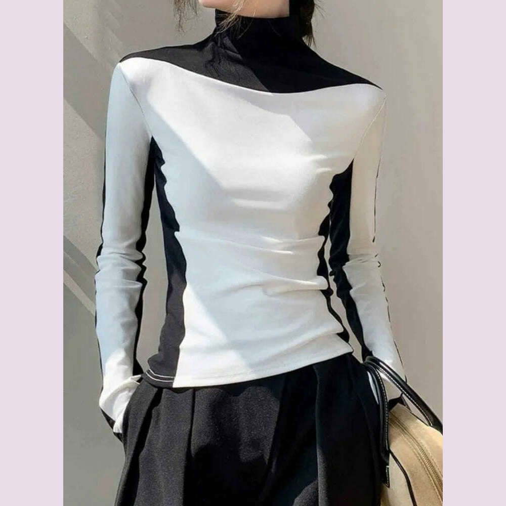 Bonboho 2025 Spring Temperament Women's Tops Black and White Contrast Color T-shirt High Neck Long Sleeves Slim Fit Shits