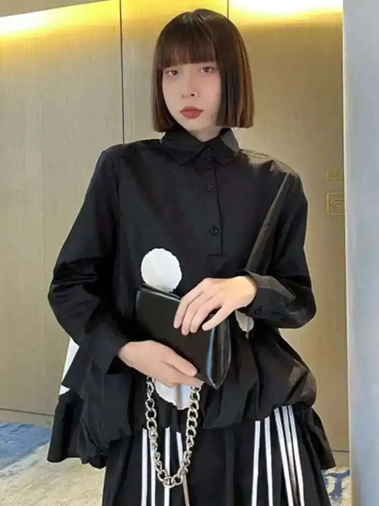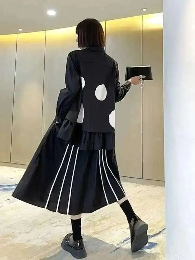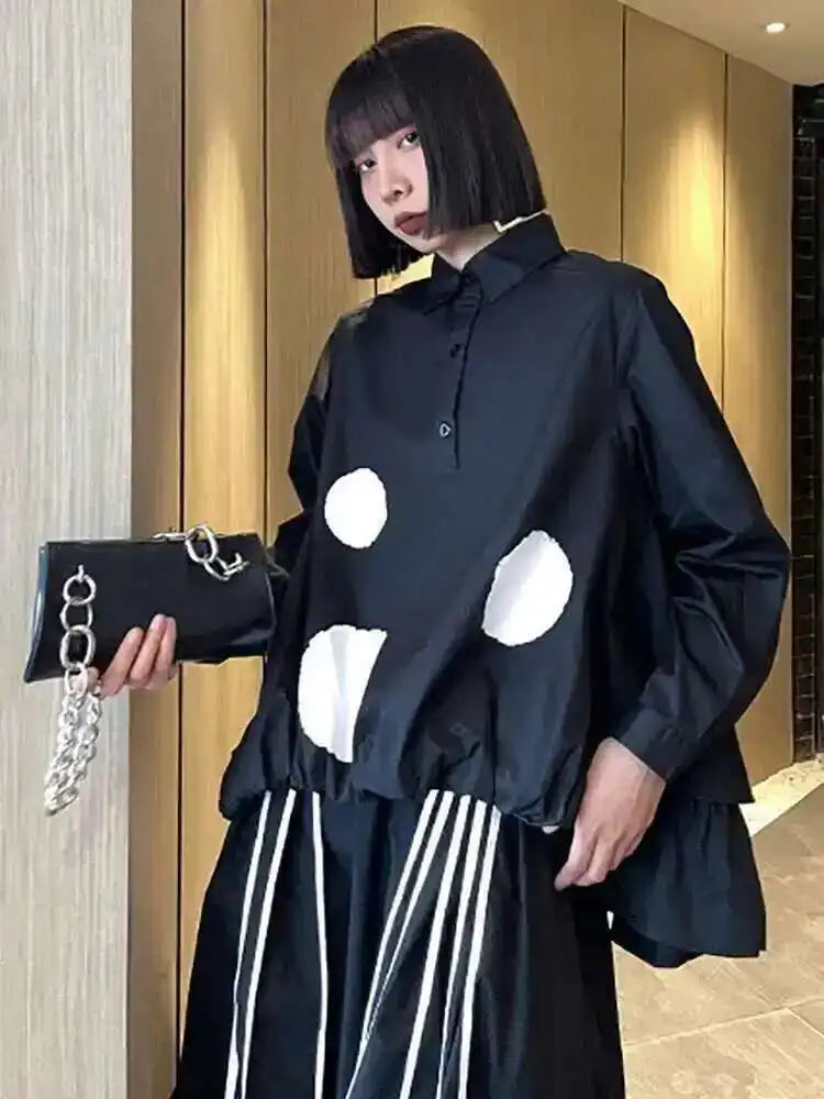 EAM Women Black Color-block Dot Big Size Blouse New Lapel Long Sleeve Large Hem Shirt Fashion Tide Spring Autumn 2024 1DH4274
