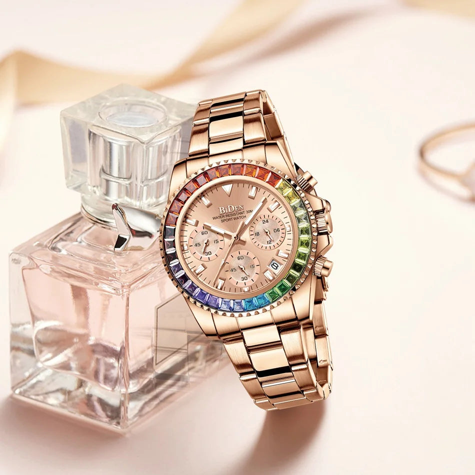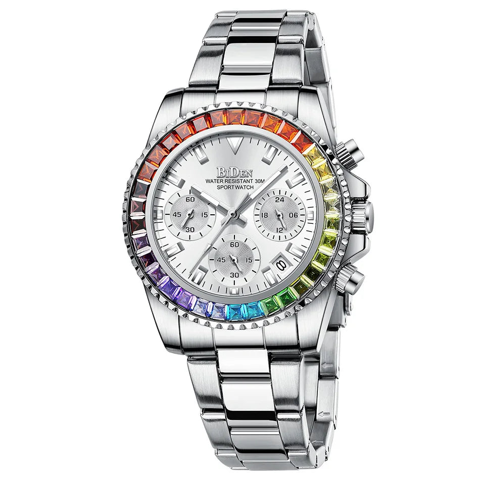 Fashion BIDEN Brand Lady Dress Watch Calendar Colorful Rhinestone Dial Casual Business Women Wristwatch Silver Stainless Steel