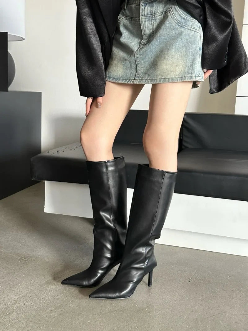 Fashion Retro Minimally Pointed Suede slim High Heels Knight Boots slip-on Knee-high Women's Shoes Pumps Botas De Mujer