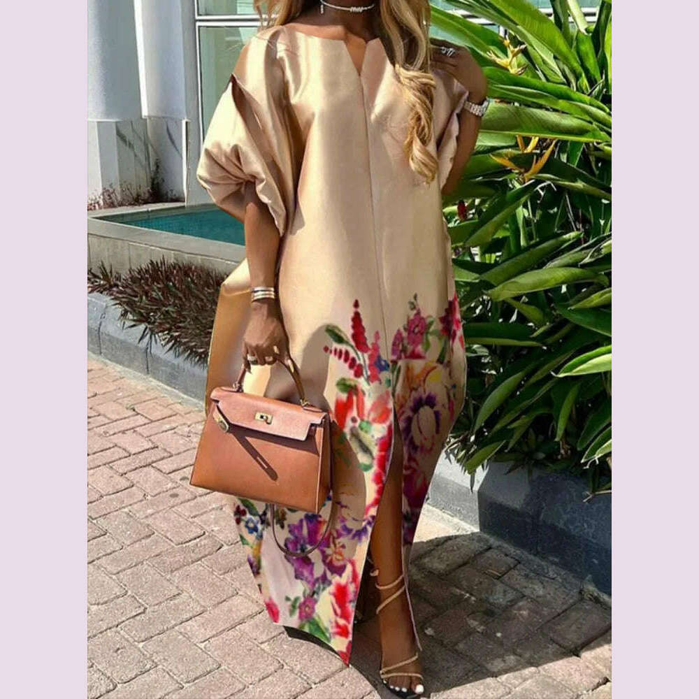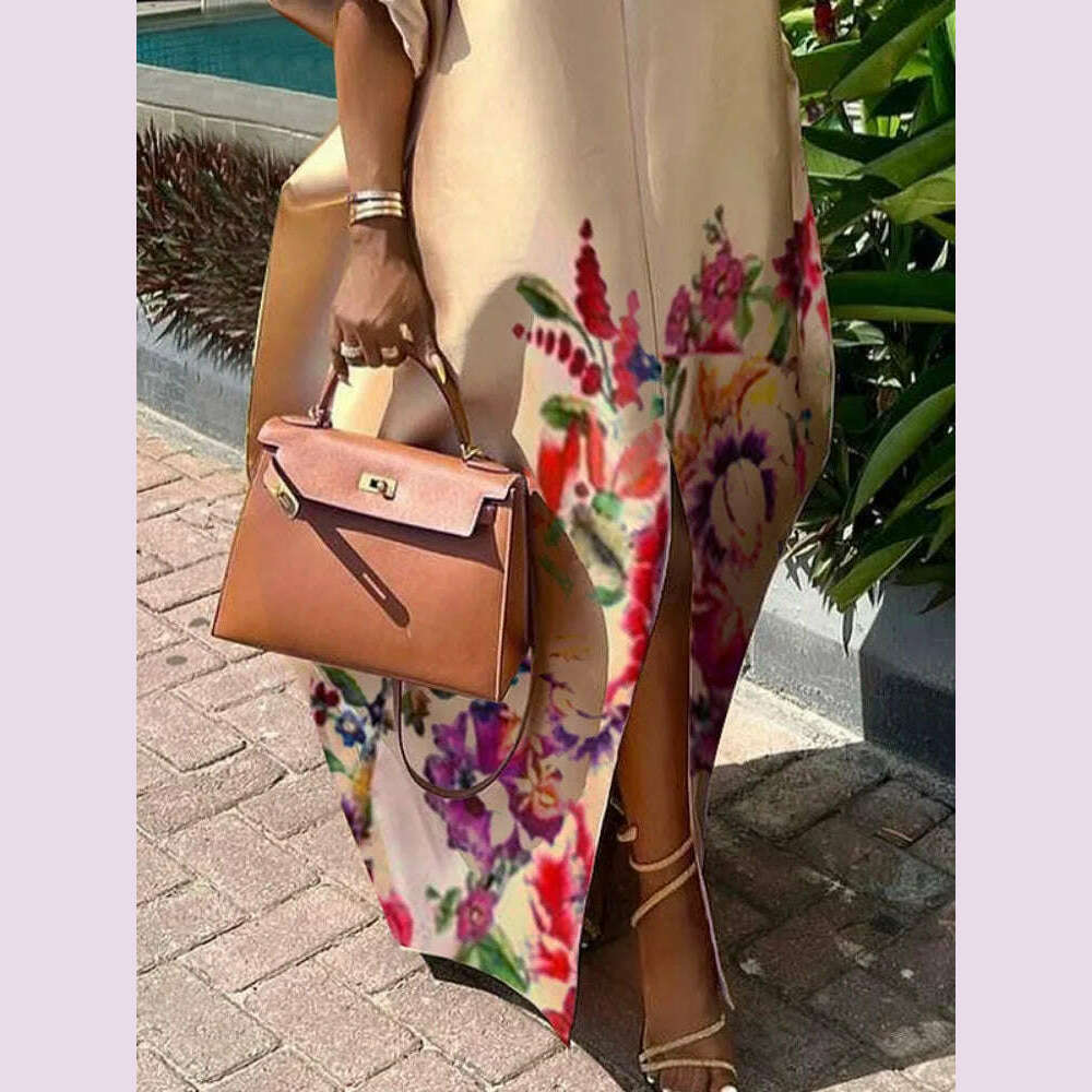 Freeacy Women's Elegant Floral Printed Maxi Dress Boat Neck Puff Sleeves H-line Splited Evening Dresses Floor Length Party Dress