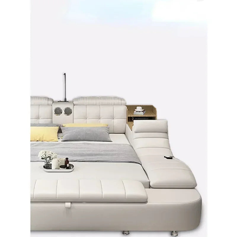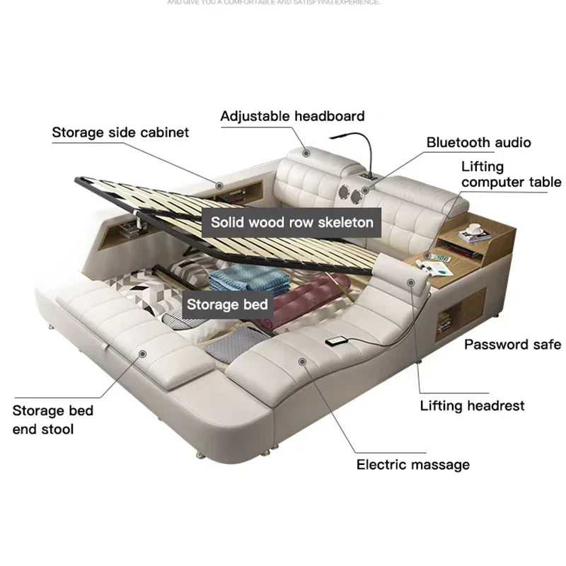 -Genuine Leather Bed Frame Soft Beds Massager Storage Safe Speaker Led Light Bedroom Recharging Bluetooth Safe Usb
