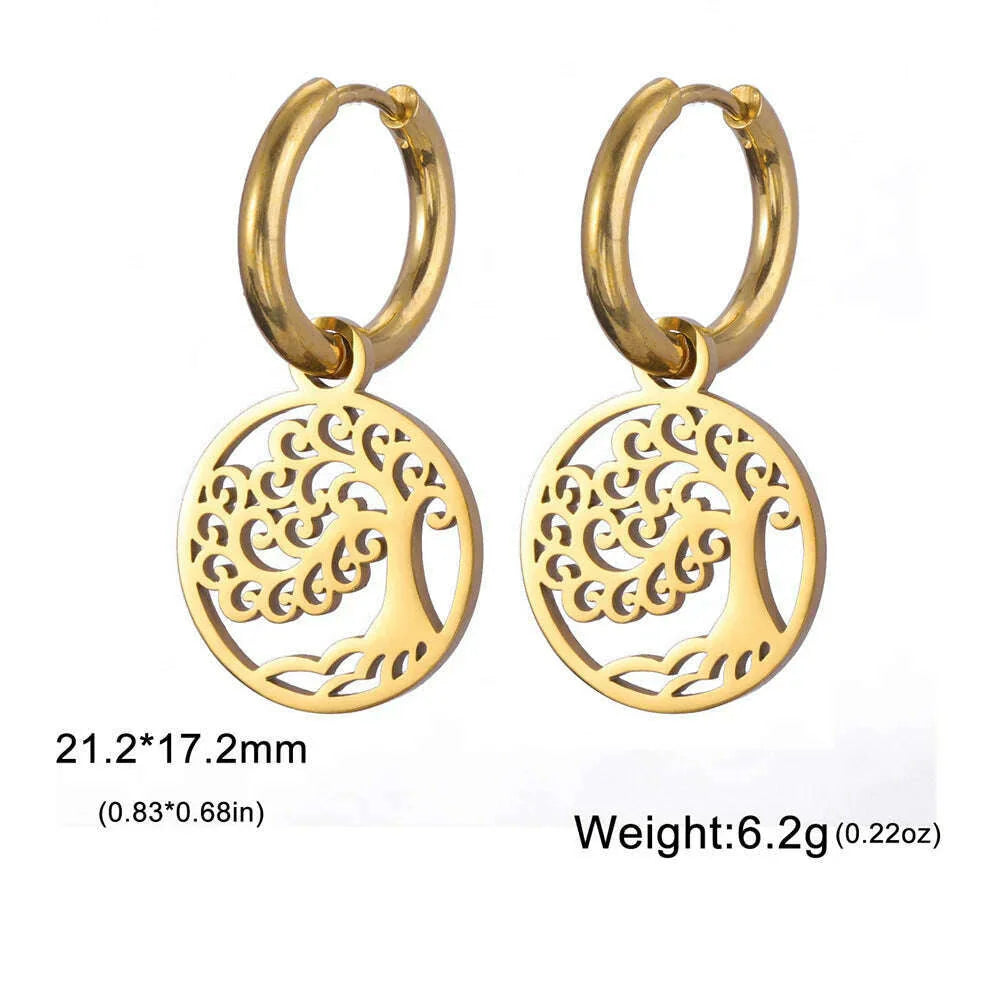 Gold Plated Tree of Life Rond Dangle Hoop Earrings for Women Stainless Steel Luxury Charm Trend Female Earring Jewelry Gifts