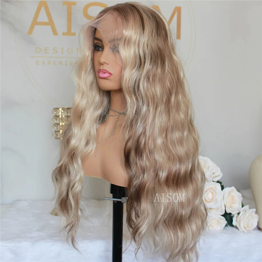 Long Wavy Synthetic Lace Front Wig Highlight Blonde Natural Wave Transparent Pre Plucked Heat Resistant Fiber Wig for Women