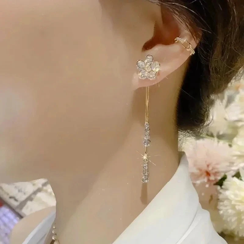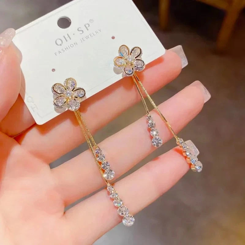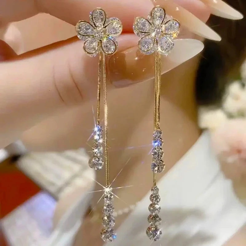 New Sweet Zircon Flower Long Tassel Pendant Stud Earrings for Women Elegant Exquisite Temperament Girls Birthday Gift Jewelry