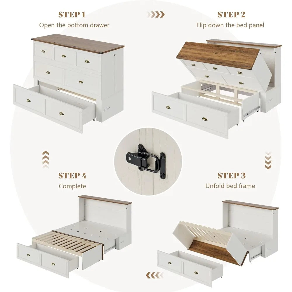 Queen Size Murphy Bed, Farmhouse Wooden Cabinet with Charging Station and Storage Drawer for Bedroom/Office/Guest Room,